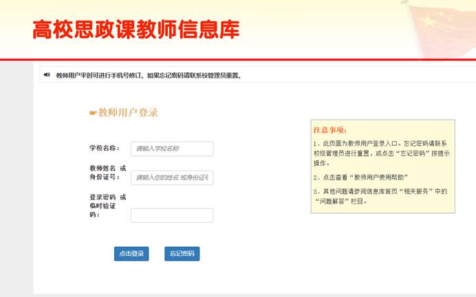 注意事项:以下选项为必填项。漏填或者不填不能保存。请检查填写是否内容和格式是否正确,特别是“出生日期”、“最后学历”、“开始从事思想政治理论课教学工作年份”。 填写不正确或者漏填显示红色。学校管理员不能进行数据上报。固定电话可以填写本单位、本部门的办公电话。 如遇到手机号被占用,无法保存。这种情况的出现一般有以下三个原因:一是自己作为兼职教师已经在别的学校,特别是独立学院登录过手机号。二是自己是从别的学校调过来的,自己手机信息已存在原高校库中。三是自己的信息在本校以错误方式重复登录过。 处理办法是联系信息原登录高校管理员,将自己设为不在岗,禁止登陆,然后删除该用户。