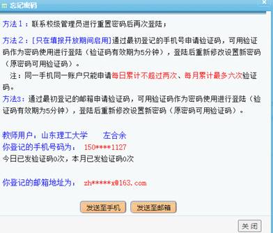 4.忘记密码: (1)请联系学校管理员重置密码。如果您不知道学校管理是谁,请咨询你校思政课教学科研机构分管负责人。 (2)由于当前移动公司为防止垃圾短信,部分手机号收不到手机短信验证码,建议联系学校管理员重置密码。该验证码即为重置的新密码。 (3)可以根据填写的邮箱,申请找回密码。该验证码即为重置的新密码。