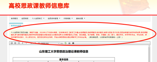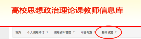 三、问卷调查 请以本年度信息更新通知为准。 四、基础设置 1.可更改本人账户密码。 2.退出系统。 常见问题提示 1、教师忘记密码:参考登录“一、教师用户登录”。 2、教师换校,即教师由A高校到B高校工作,由B高校提供证明教师在本校工作的材料(如加盖学校或者马院公章的说明,说明中要包含姓名,身份证号,手机号,由A高校到B高校,申请调整信息库内调整),发至信息库网站上邮箱(szkjsxxk@sdut.edu.cn或者szkjsxxk@126.com),两个工作日内或收到回复邮件后,联系B高校管理员重置密码后使用。 3、集体备课平台、课表录入、听课调研不属于信息库更新,请联系集体备课平台、课表录入、听课调研的技术支持。 | ||