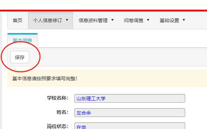 1.基本信息:新增教师和个人信息有变动的老师(如老师的手机号更换、学历提升)填写 依次在对话框中填写个人基本信息,按照要求填写完整,其中“民族”“出生日期”“职称”“最后学历”“所学学科专业”、“学位名称”、“所在学科点名称”、“开始从事思想政治理论课教学工作年份”请点击“选择”录入。填写完整后点击左上角“保存”,如下图所示位置。