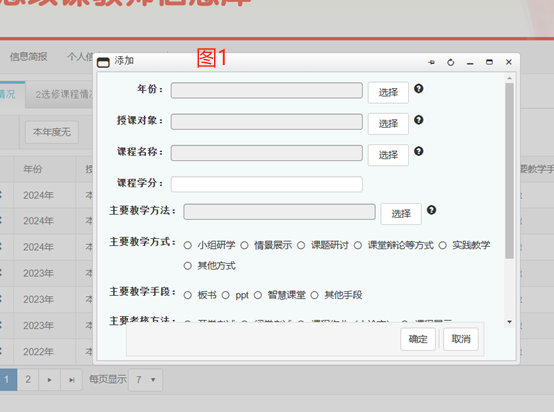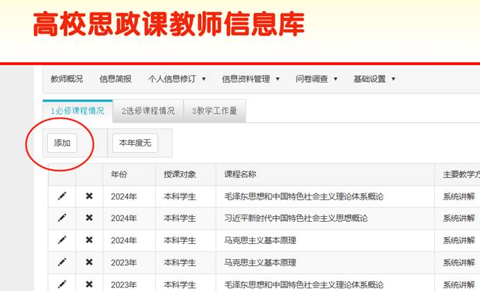 2.教学情况 (1)此项目为必填项。漏填或错填显示本人信息显示红色不完整状态。根据图示选择“添加”按钮,因此选择相应课程及教学信息,填写完毕,点击页面右下角“确定”按钮保存。依次增加“必修课程情况”“选修课程情况”、“教学工作量”。