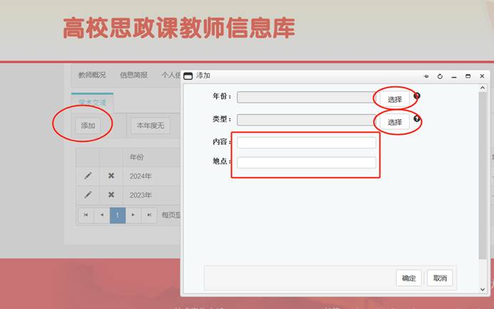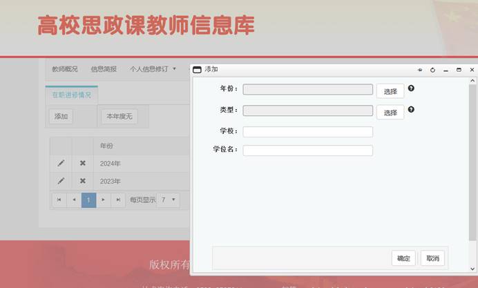 6.在职进修情况 请根据实际参加情况依次填写,填写后请保存。添加-选择年份-选择年份-填写学校-填写学位名-确定。