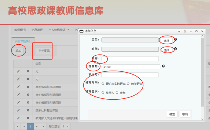 如本年度无成果,点击“本年度无”。 9.承担课题情况 请根据实际参加情况依次填写,填写后请保存。添加-选择类型-选择时间-填写名称-经费-项目号-选择研究方向-研究位次-确定。