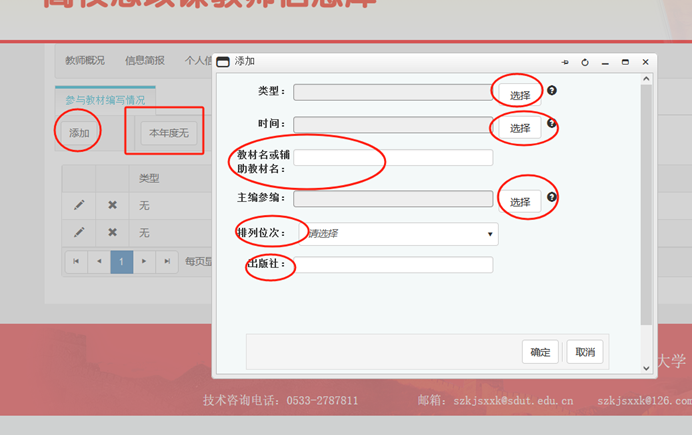 8.教学课程成果 请根据实际参加情况依次填写,填写后请保存。添加-选择类型-选择年份-填写名称-著作类型-出版社-刊发日期确定。
