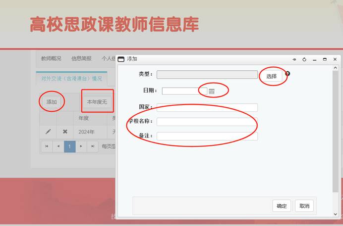 如本年度没有兼职,点击“本年度无”。 15.对外交流情况 请根据实际参加情况依次填写,填写后请保存。添加-选择类型-兼职日期- -填写国家-学校名称-备注-确定。