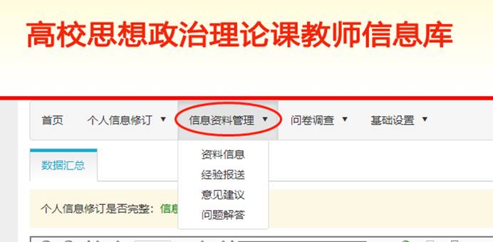 信息简报:可看到本校在全国高校的情况。 二、个人信息修订:点击“个人信息修订” 信息填报直接关系本校思政课教师队伍建设排名情况,也反映教师本人在整个教师队伍中的发展结果情况。今后将择机定期发布。请老师认真逐项填报,如实填写。弄虚作假会直接导致排名大幅降低。相应项目发生变化请及时更新。