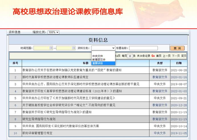 1.资料信息 中央、教育部关于思政课、马克思主义学院、思政课教师的相关文件。可根据文件时间、类型、标题查询。
